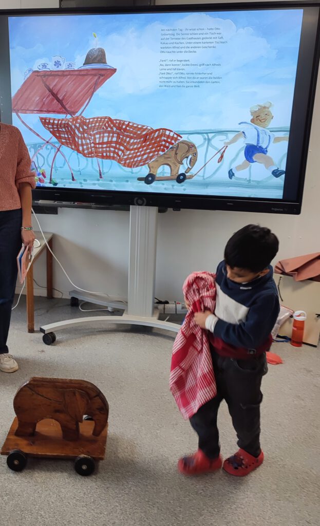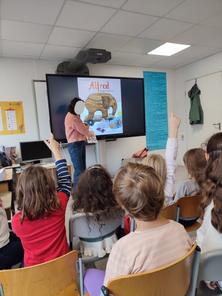 Am 8.10. und 9.10.2025 besuchte die Autorin und Illustratorin Kristina Heldmann vier Schulanfangsphasenklassen für jeweils eine Lesung in der Gustav-Falke-Schule. Am 9.10. stellte sie ihr Buch „Alfred: Elefant seit 1932“ in der Klasse 1/2 b vor.