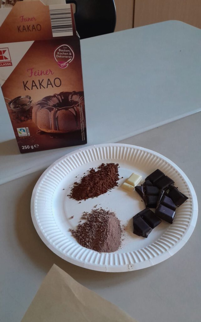 Im Rahmen der NaWi-AG beschäftigten sich die Schülerinnen und Schüler der 1. Klasse (1/2b) altersgerecht und forschend mit dem Thema Schokolade. Ausgangspunkt war die Frage: Woher kommt Schokolade eigentlich?