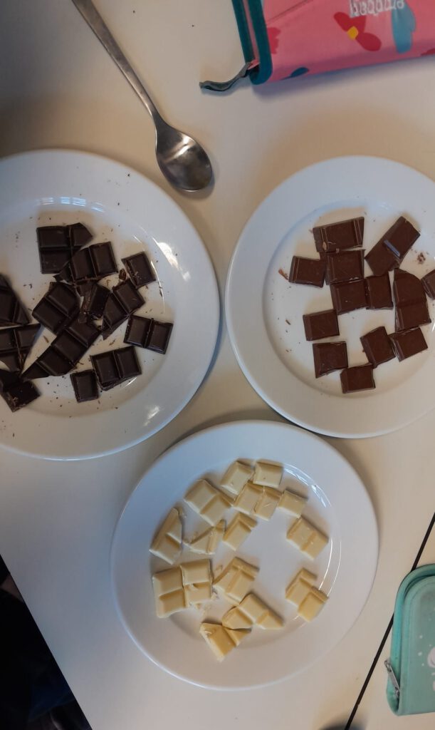 Bei einer Verkostung verglichen die Kinder Zartbitter-, Vollmilch- und weiße Schokolade und beschrieben deren Geschmack.