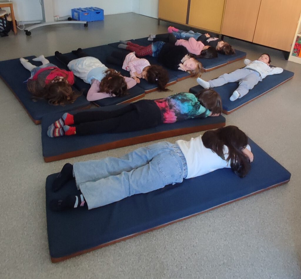 Im Rahmen der Projektwoche beschäftigten sich die Kinder mit dem Thema Entspannung und Wohlbefinden. Sie überlegten gemeinsam, wann Menschen Ruhe brauchen und lernten einfache Entspannungsübungen kennen, wie Autogenes Training und eine Traumreise mit Schmetterlingen bei ruhiger Musik.