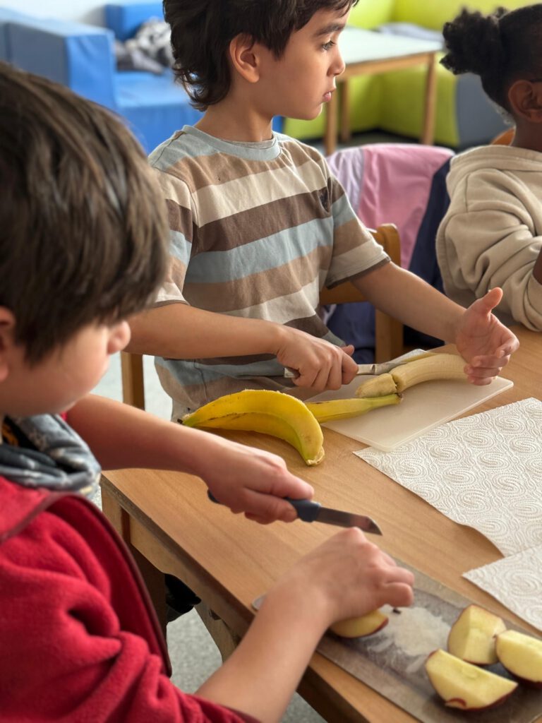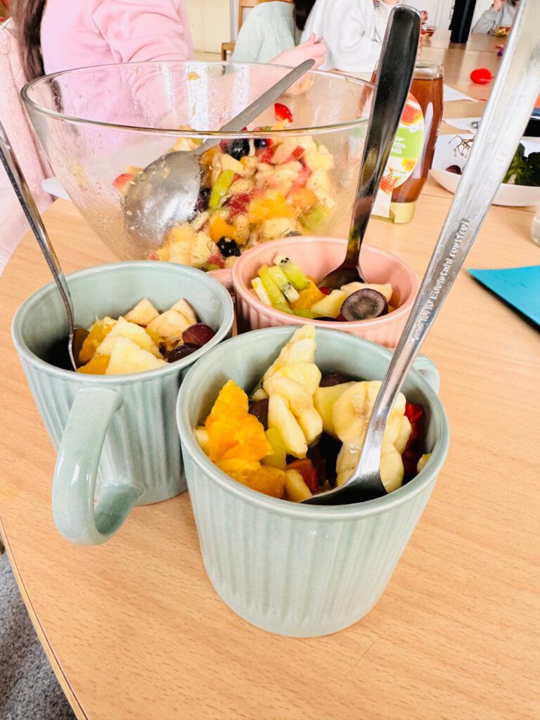 Im Rahmen des Themas „Gesund und lecker“ beschäftigten sich die Kinder mit Obst und gesunder Ernährung. Sie lernten, warum Obst mit seinen Vitaminen, Mineralstoffen und Ballaststoffen wichtig für den Körper ist. Anschließend bereiteten sie gemeinsam einen bunten Obstsalat aus verschiedenen Früchten zu. Außerdem stellten sie in der Smoothie-Gruppe aus Obst und Gemüse unterschiedliche Smoothies her und probierten verschiedene Kombinationen. Dabei entdeckten die Kinder mit viel Freude, wie lecker gesunde Lebensmittel sein können.