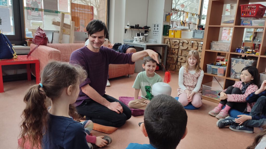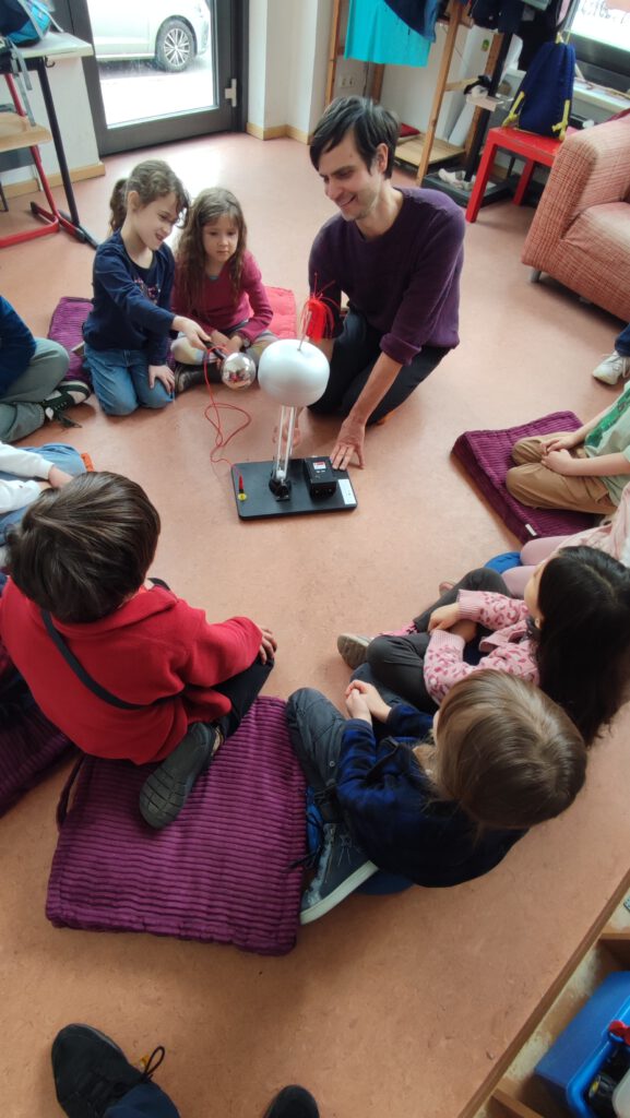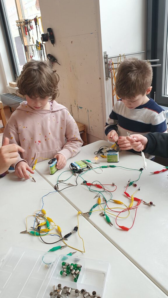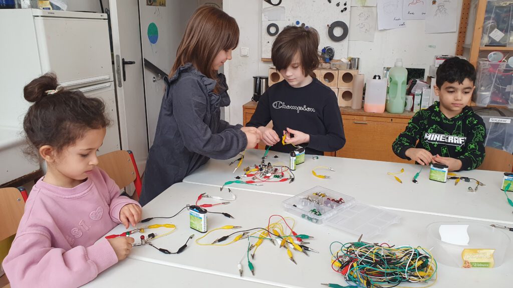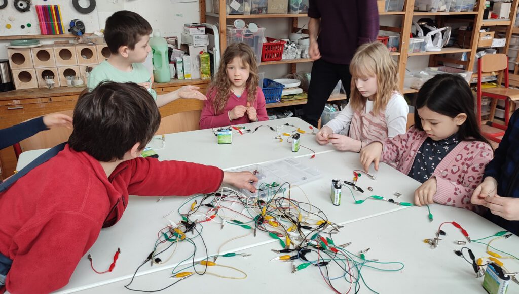 In der „Zauberhaften Physik“ setzten wir uns mit dem Thema „Strom“ auseinander. Die Kinder erlebten, wie Strom sichtbar gemacht werden kann und experimentierten mit Batterien und vielen Kabeln, um Stromkreise zu schließen und kleine GlĂźhlampen zum Leuchten zu bringen. Dabei hatten sie wie immer mit dem Lernwerkstättenleiter Klaus Trebeß sehr viel Spaß.