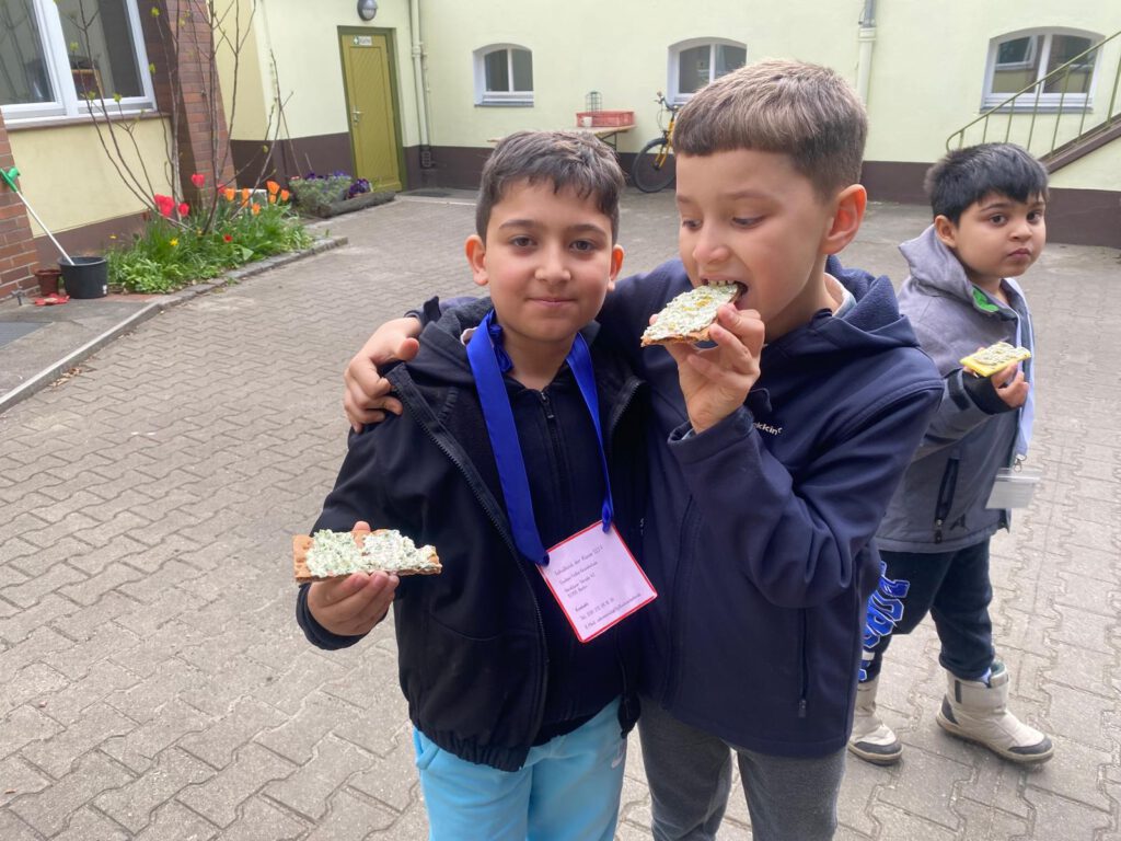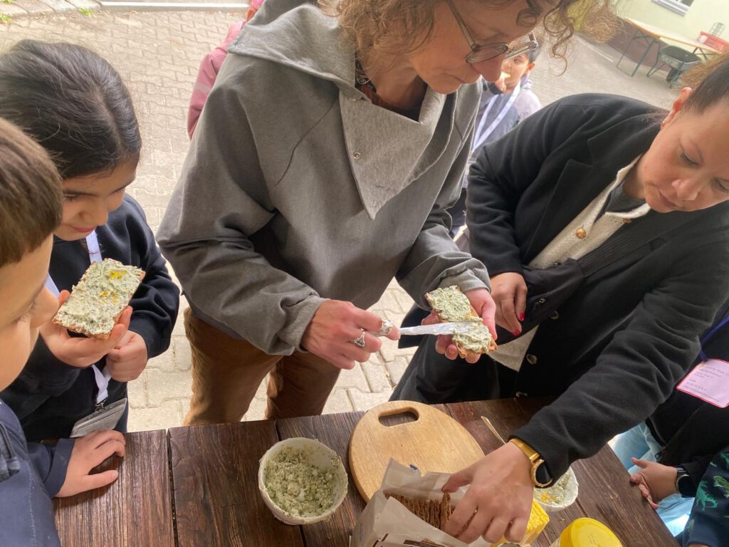 Danach wurden die gesammelten Kräuter klein geschnitten und unter die Butter gemischt. Zum Abschluss durfte natürlich probiert werden: Auf köstlichem Brot schmeckte die selbstgemachte Kräuterbutter besonders gut. Alle waren sich einig – das war nicht nur lecker, sondern hat auch richtig viel Freude gemacht! Wir bedanken uns herzlich beim Team des Schulumweltzentrums für diesen gelungenen Tag.