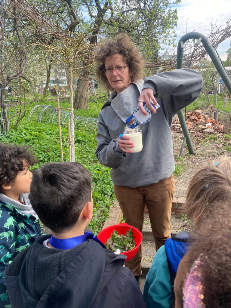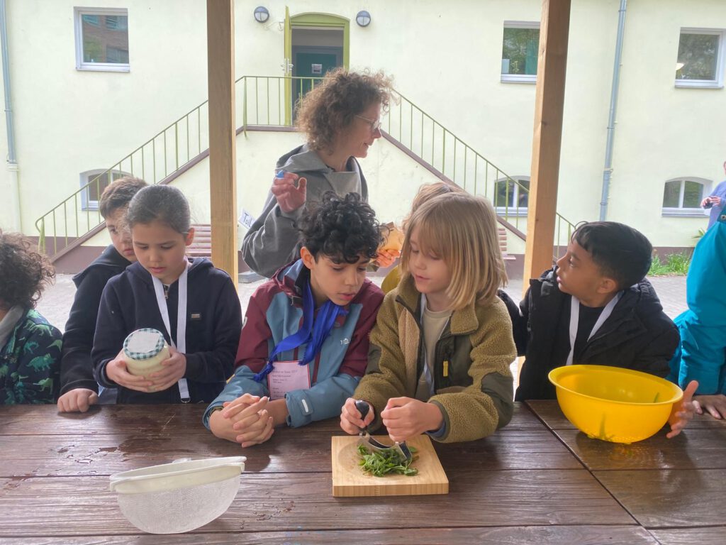 In kleinen Gruppen sammelten die Kinder selbst Kräuter und konnten so die Natur ganz aktiv erleben. Ein besonderes Highlight war die eigene Butterherstellung. Mit viel Begeisterung schüttelten die Kinder Sahne, bis daraus frische Butter entstand.