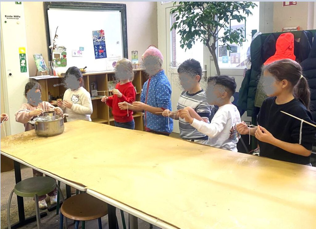 Die Klasse 1/2/3f unternahm vergangene Woche einen spannenden Ausflug ins Schulumweltzentrum, um dort eigene Kerzen herzustellen. Schon beim Betreten des Raumes war die Vorfreude groß – schließlich wartete auf die Kinder ein langer Tisch, an dessen beiden Enden Gefäße mit flüssigem Wachs bereitstanden.